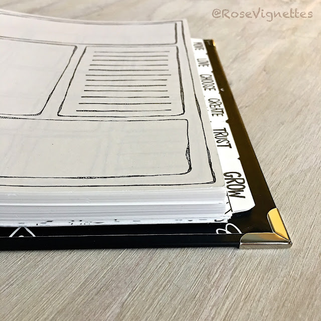 This a very nice 3-ring binder with reinforced corners and a lay-flat feature. The paper is card stock. I have used watercolor on the pages and they only slightly buckle and press out over time. The dividers are actually watercolor paper that you can color in as you wish. The dividers are labeled with the word of the month that Stephanie's weekly email focuses on.